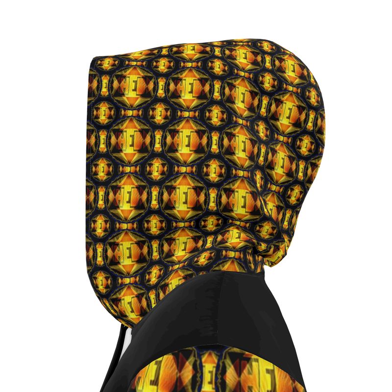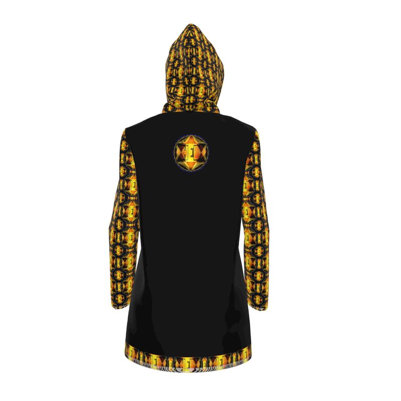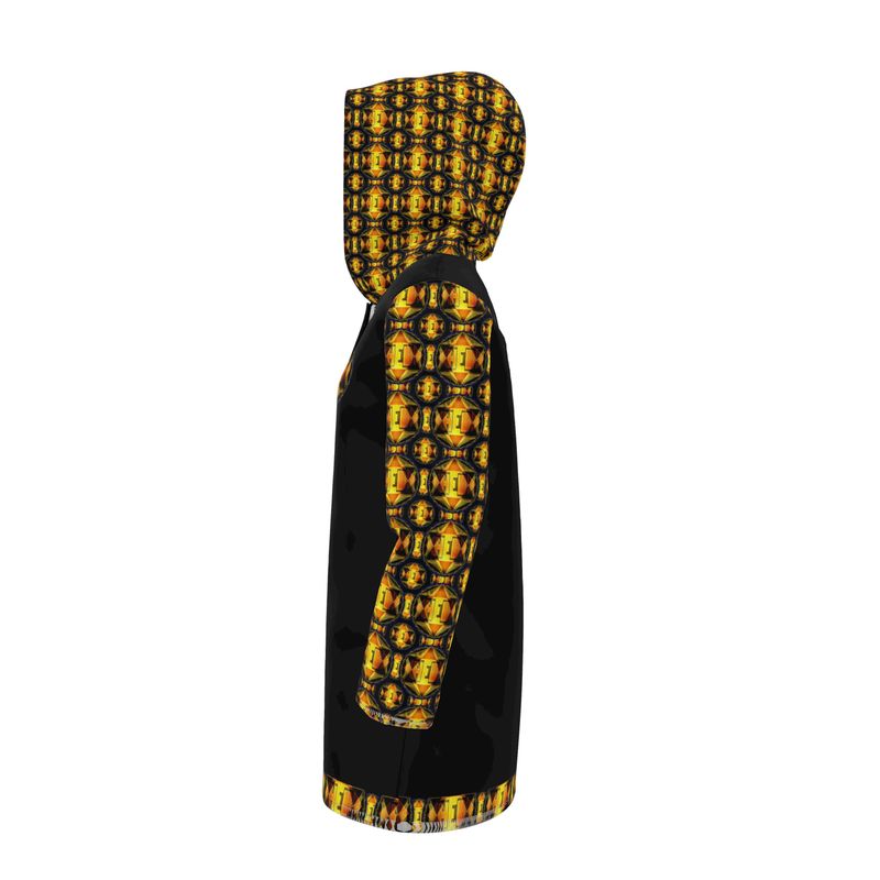 The intricate, geometric gold pattern adorning the sleeves and hood echoes the structural majesty of the Temple, reflecting a "Royal Radiance" that cannot be dimmed by the storm. Whether you are navigating a literal downpour or the symbolic "rains" of life, this coat serves as a visual testament to your identity: resilient, set apart, and eternally luminous. Armor yourself in a design that bridges the gap between ancient lineage and futuristic protection.
