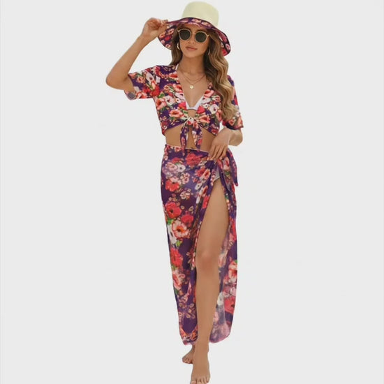 Whether you’re strolling along a white-sand beach or lounging poolside at a boutique resort, the sheer, airy fabric catches the breeze to create a silhouette that is both effortless and sophisticated. Its generous length allows for versatile styling, transforming from a high-waisted maxi skirt with a daring side slit to a chic halter-style dress in seconds. Let the vibrant reds and soft creams of the "Tropical Bloom" print transport you to a private paradise.